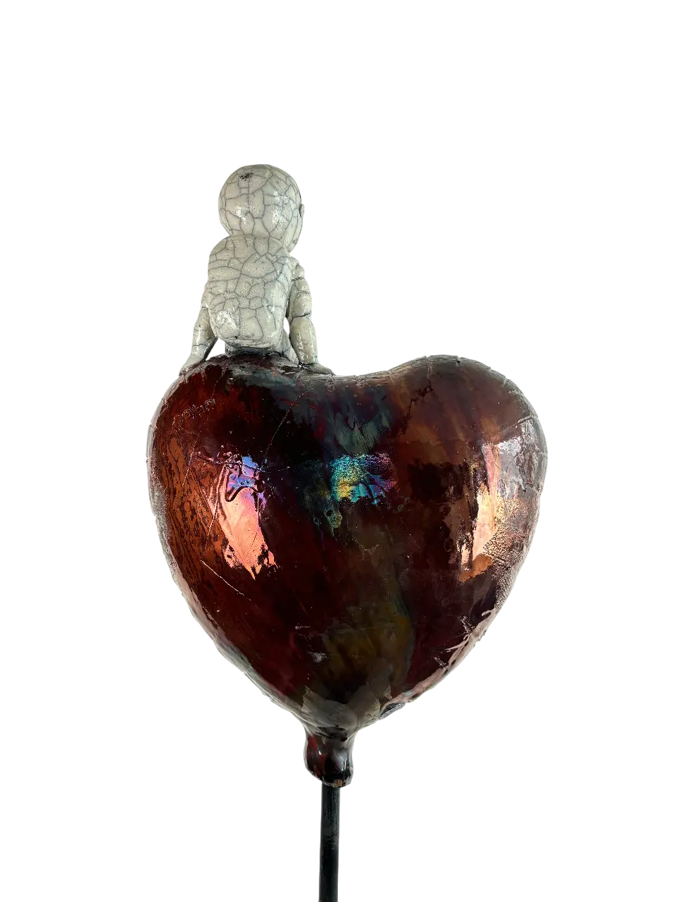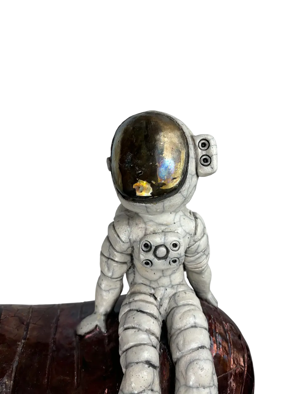 Suspendido entre la ingravidez y la fragilidad, parece descansar en el límite entre la esperanza y el absurdo. Su gesto sereno contrasta con la inestabilidad del objeto que lo sostiene: un símbolo inflado de aire, tan liviano como las promesas humanas en medio del universo.