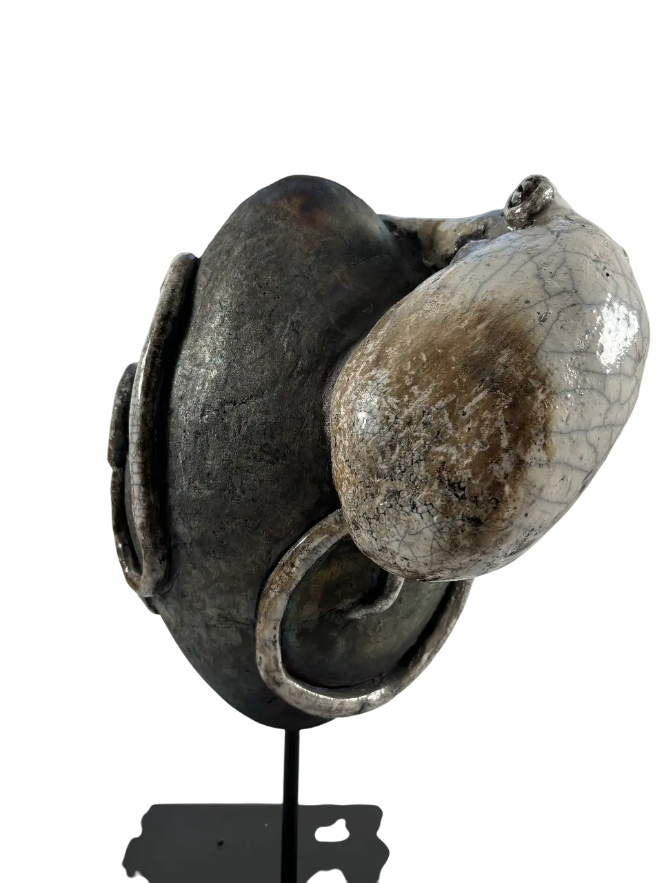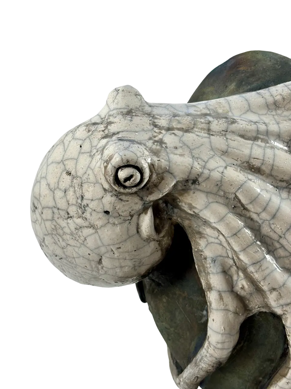 El Guardián del Silencio reflexiona sobre el origen y la vulnerabilidad. El pulpo, figura de lo ancestral y lo enigmático, sostiene entre sus brazos el misterio de la existencia. El huevo, cubierto por la sombra y la ternura del monstruo, representa el ciclo eterno de lo que muere y vuelve a surgir.