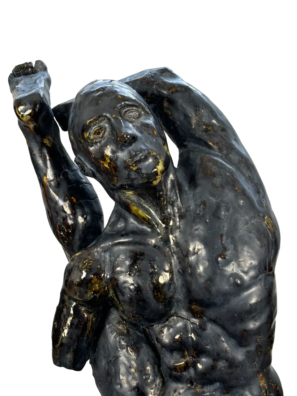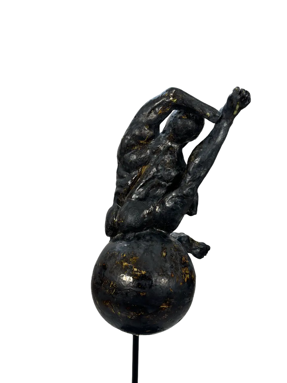 Bajo esa superficie, apenas se asoma la piel, de un tono amarillento que parece emitir luz desde dentro. La figura se dobla, se encierra, pero también resiste: una coreografía entre el deseo y la asfixia.