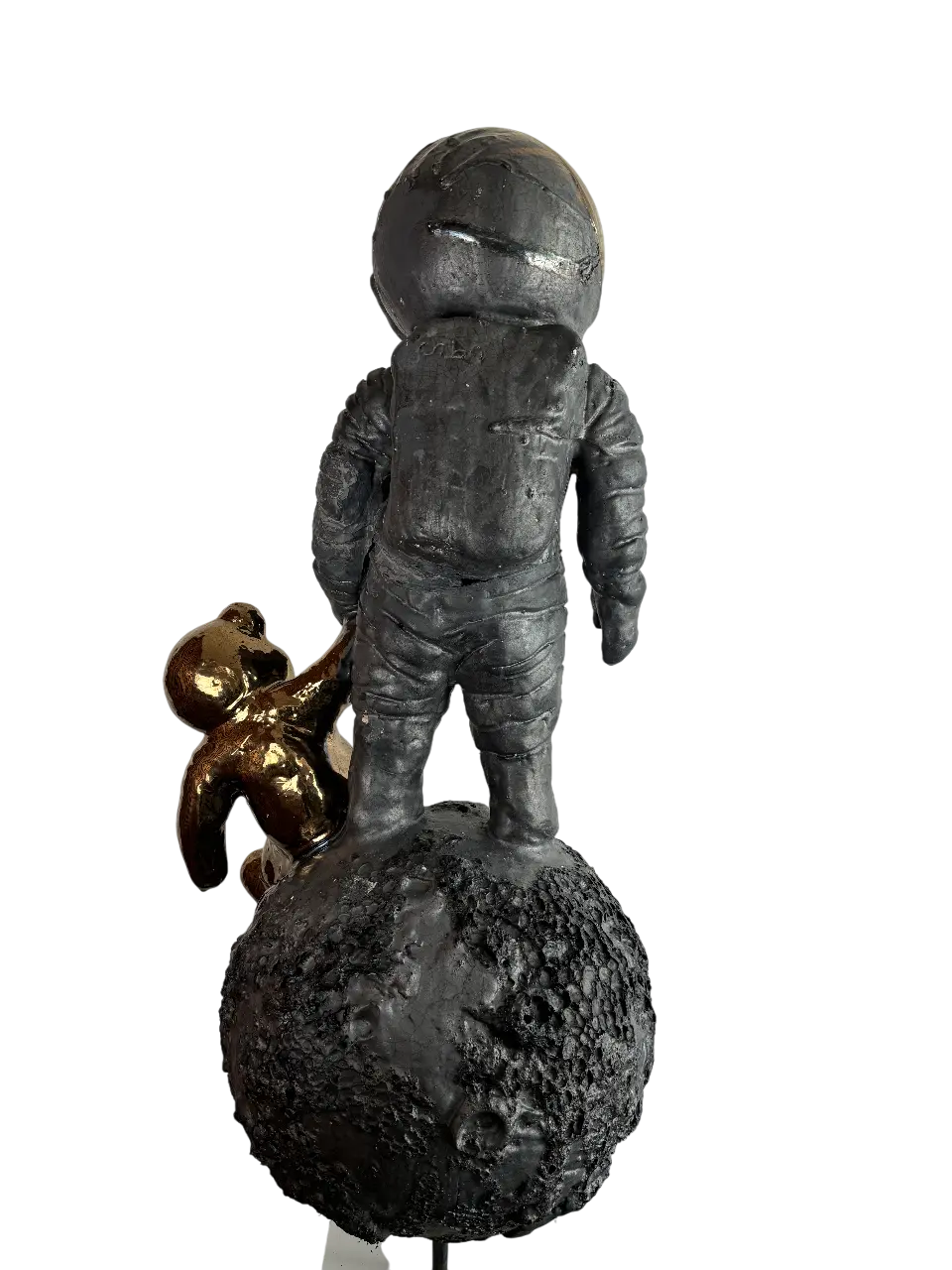 Un niño en traje de astronauta abraza su osito mientras contempla las estrellas desde la superficie lunar.